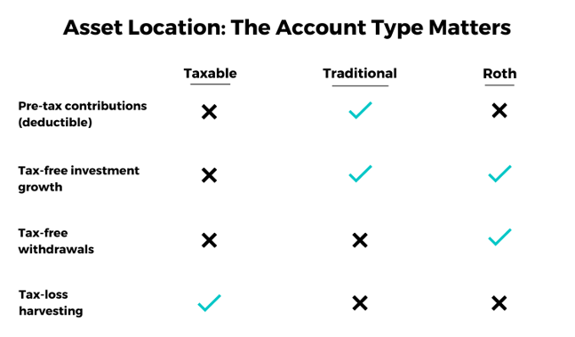 Asset location is a retirement strategy that prioritizes investing in a combination of tax-free, tax-deferred, and taxable accounts to maximize after-tax returns. This mixture of accounts helps create a flexible income stream because each account has different tax treatments. So while one account may have required minimum distributions that could increase your taxable income, another account may not – and finding this balance between tax-efficiency is the core principle of asset location.